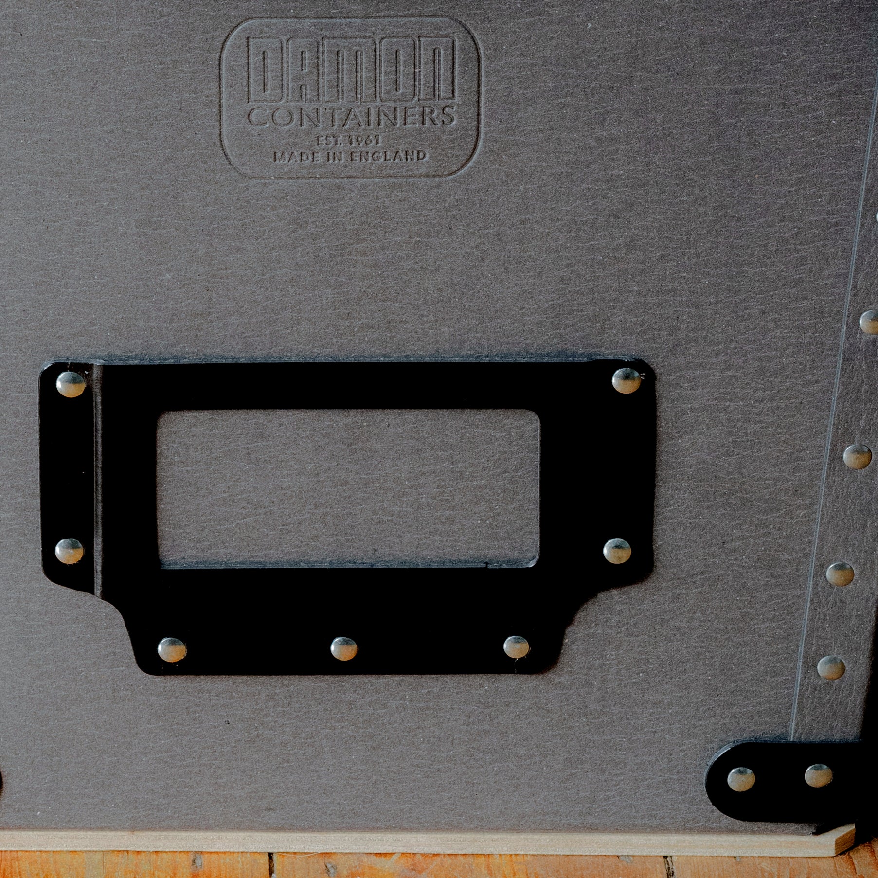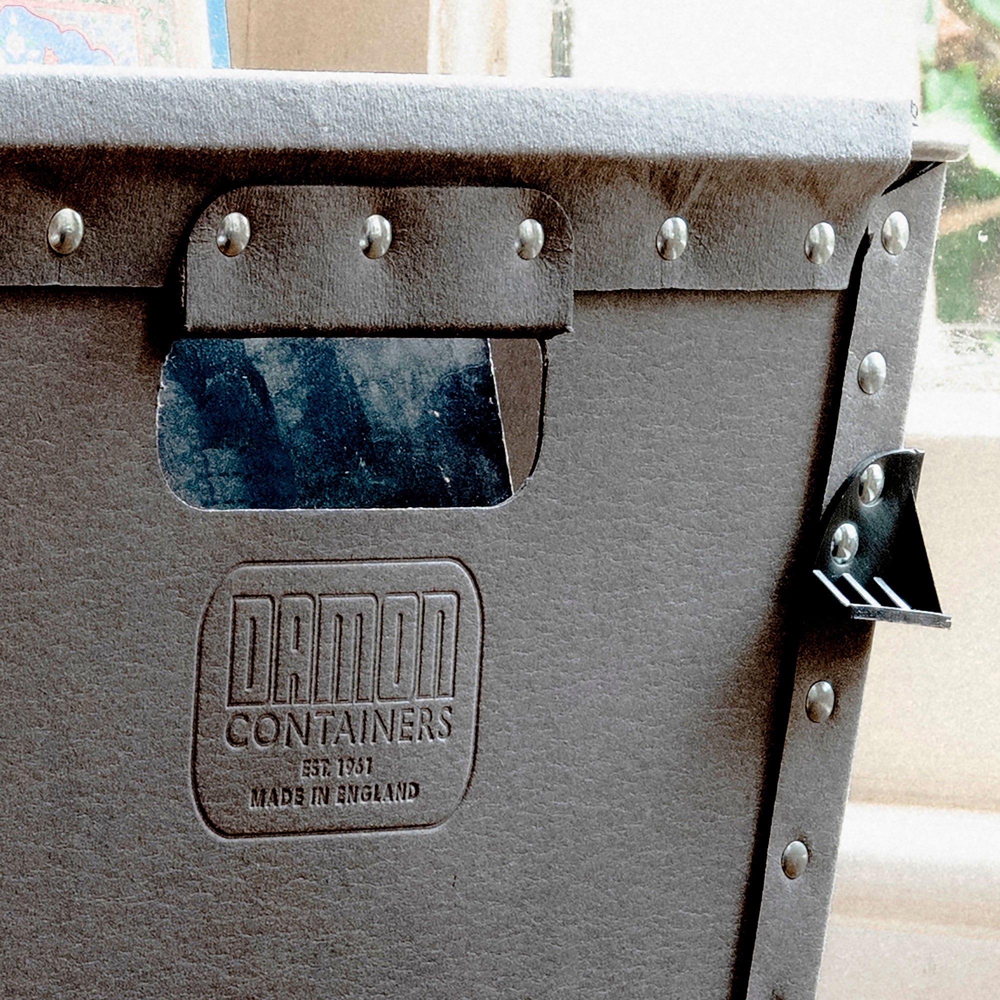 Each Damon Container lid is individually handmade to order. Cut fibreboard panels are bent and fixed around a rigid wire frame, with rivets applied using vintage machinery operated by humans and guided by eye. Finished with protective plastic covers to the corners. This process ensures each lid has a unique, slightly irregular finish.