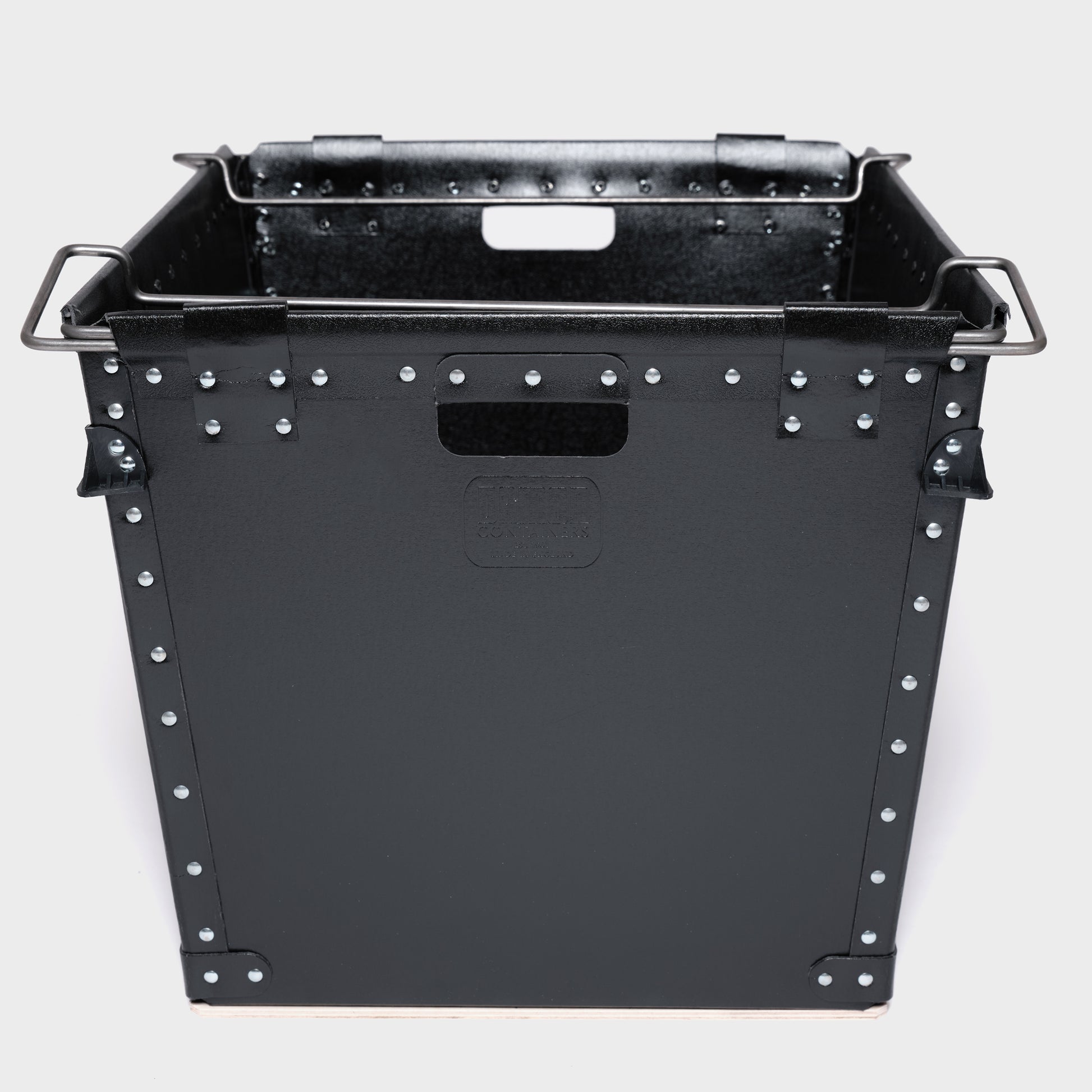 Every Damon Container is individually handmade to order. Cut fibreboard panels are bent and fixed around a rigid wire frame, with rivets applied using vintage machinery operated by humans and guided by eye. This process ensures each container has a unique, slightly irregular finish. Each container is completed with a sturdy plywood base for enhanced durability and features a tapered design for nested storage when not in use.