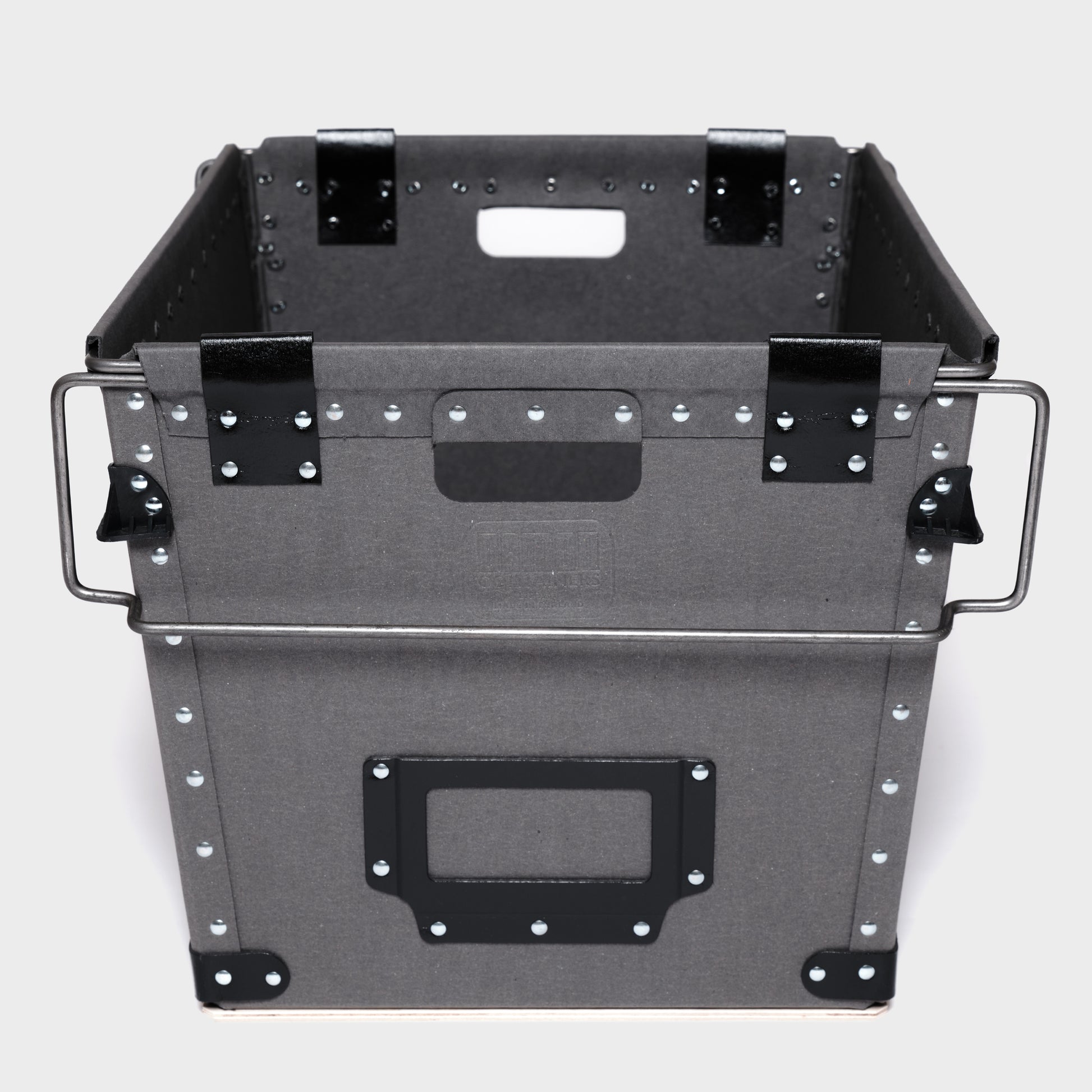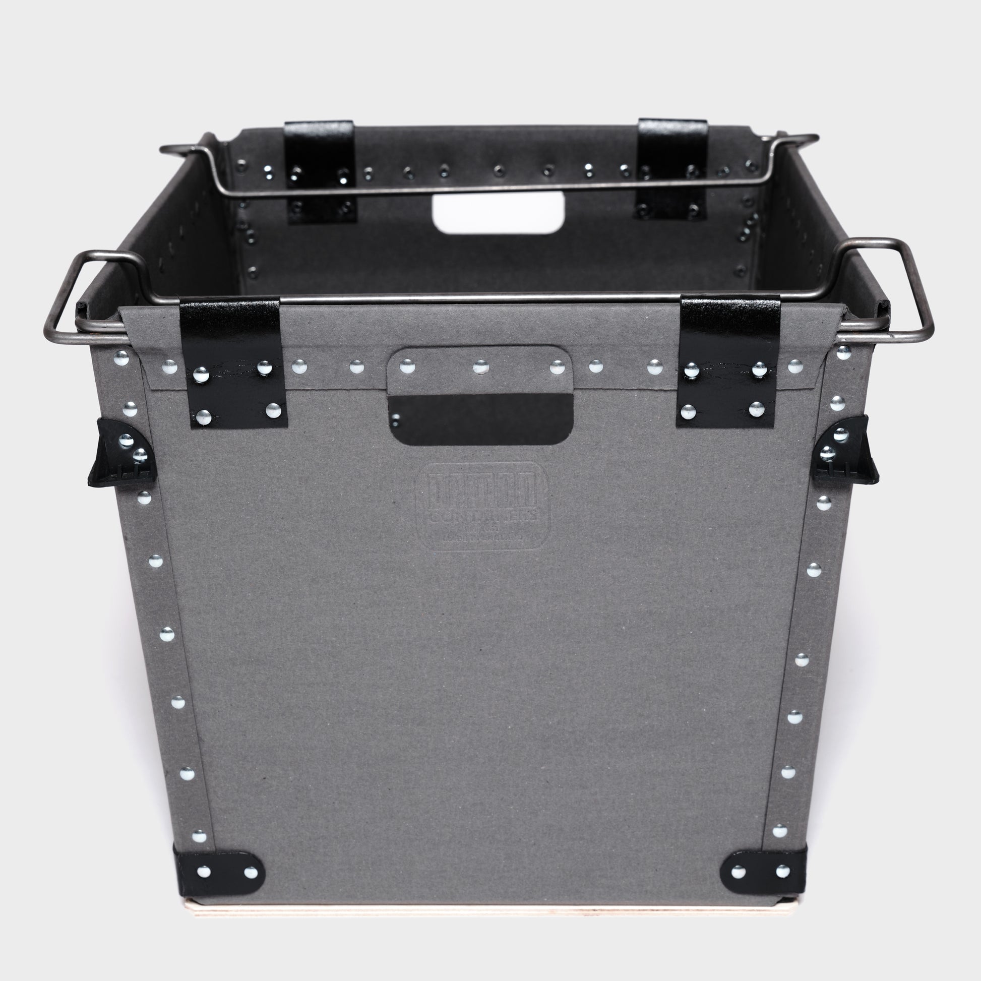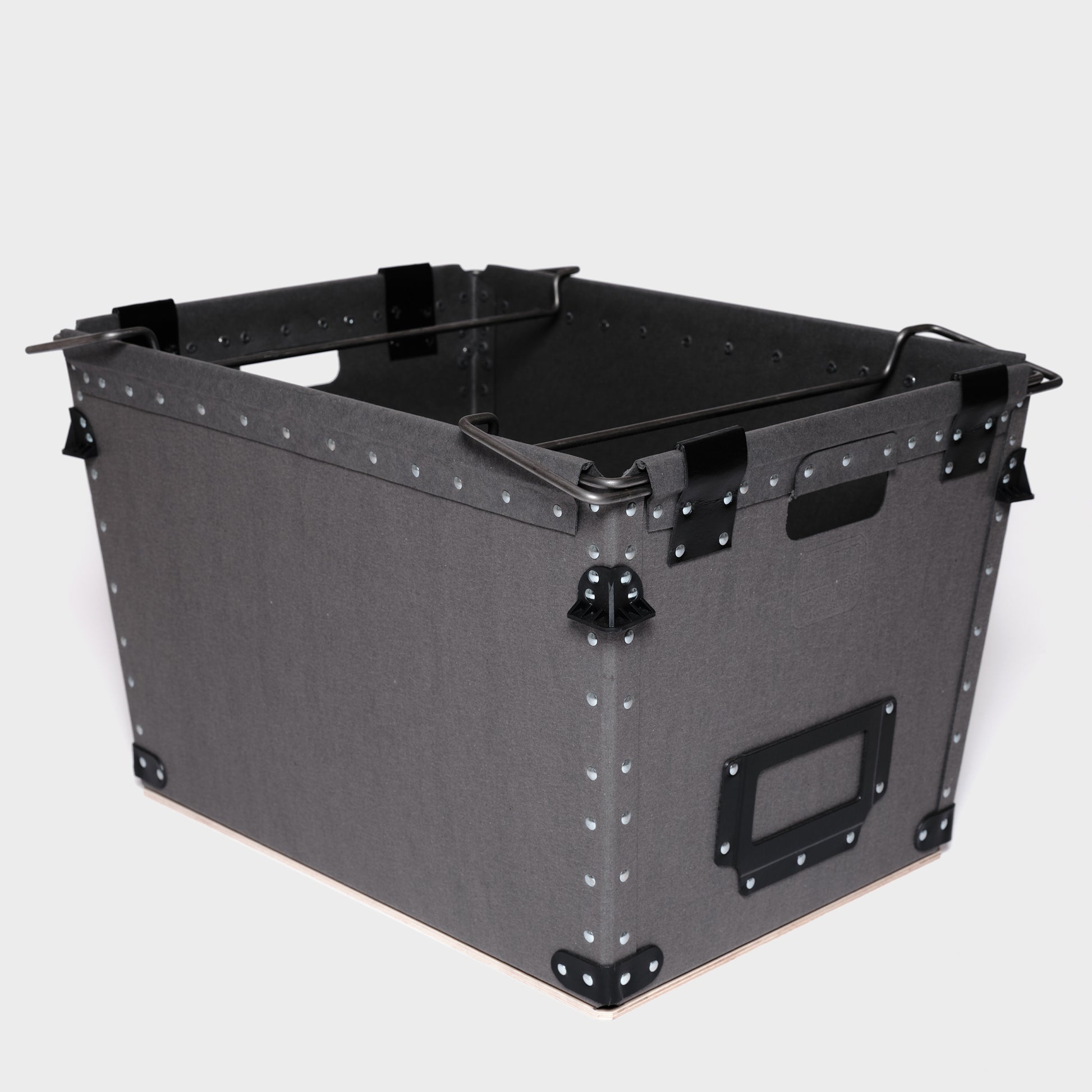 Every Damon Container is individually handmade to order. Cut fibreboard panels are bent and fixed around a rigid wire frame, with rivets applied using vintage machinery operated by humans and guided by eye. This process ensures each container has a unique, slightly irregular finish. Each container is completed with a sturdy plywood base for enhanced durability and features a tapered design for nested storage when not in use.