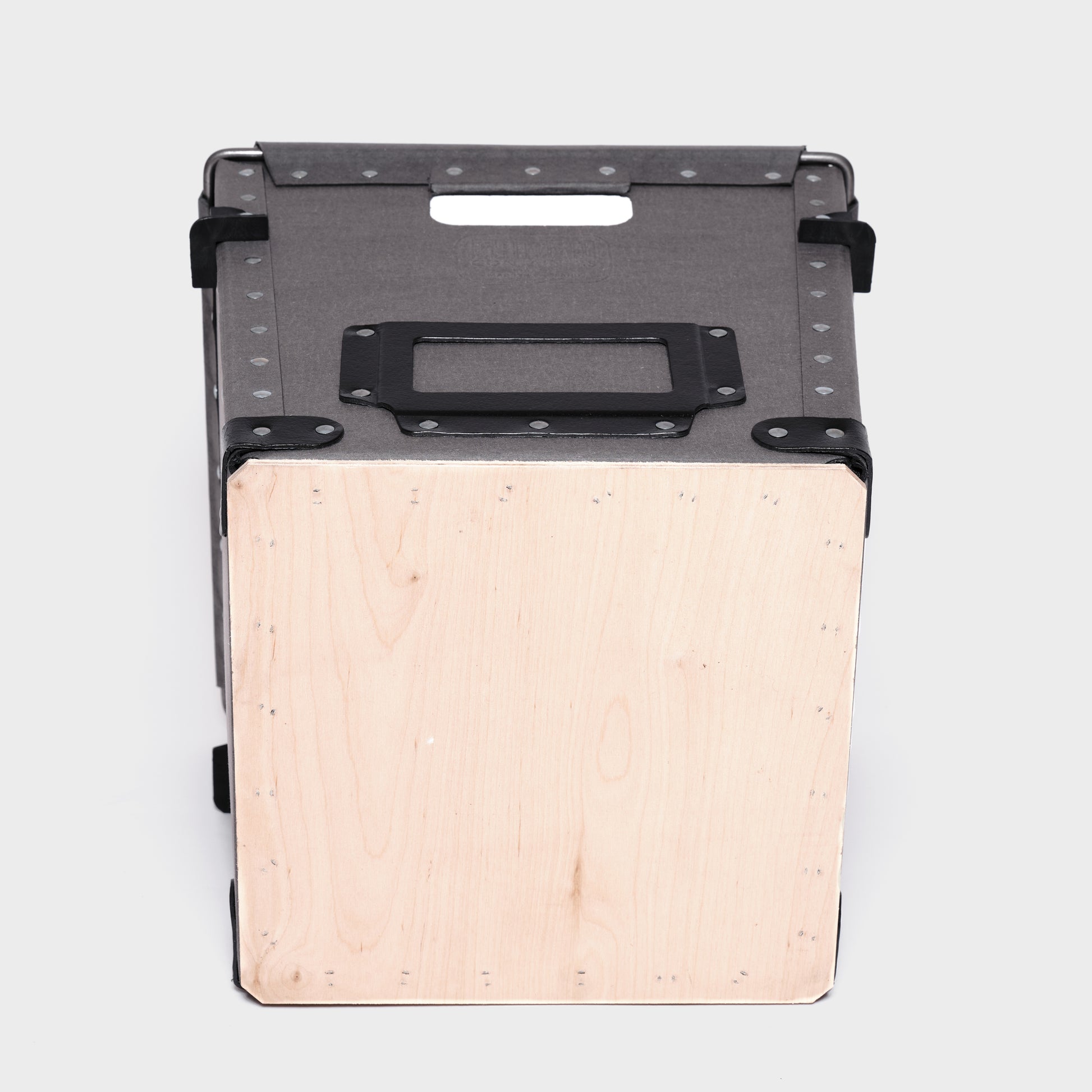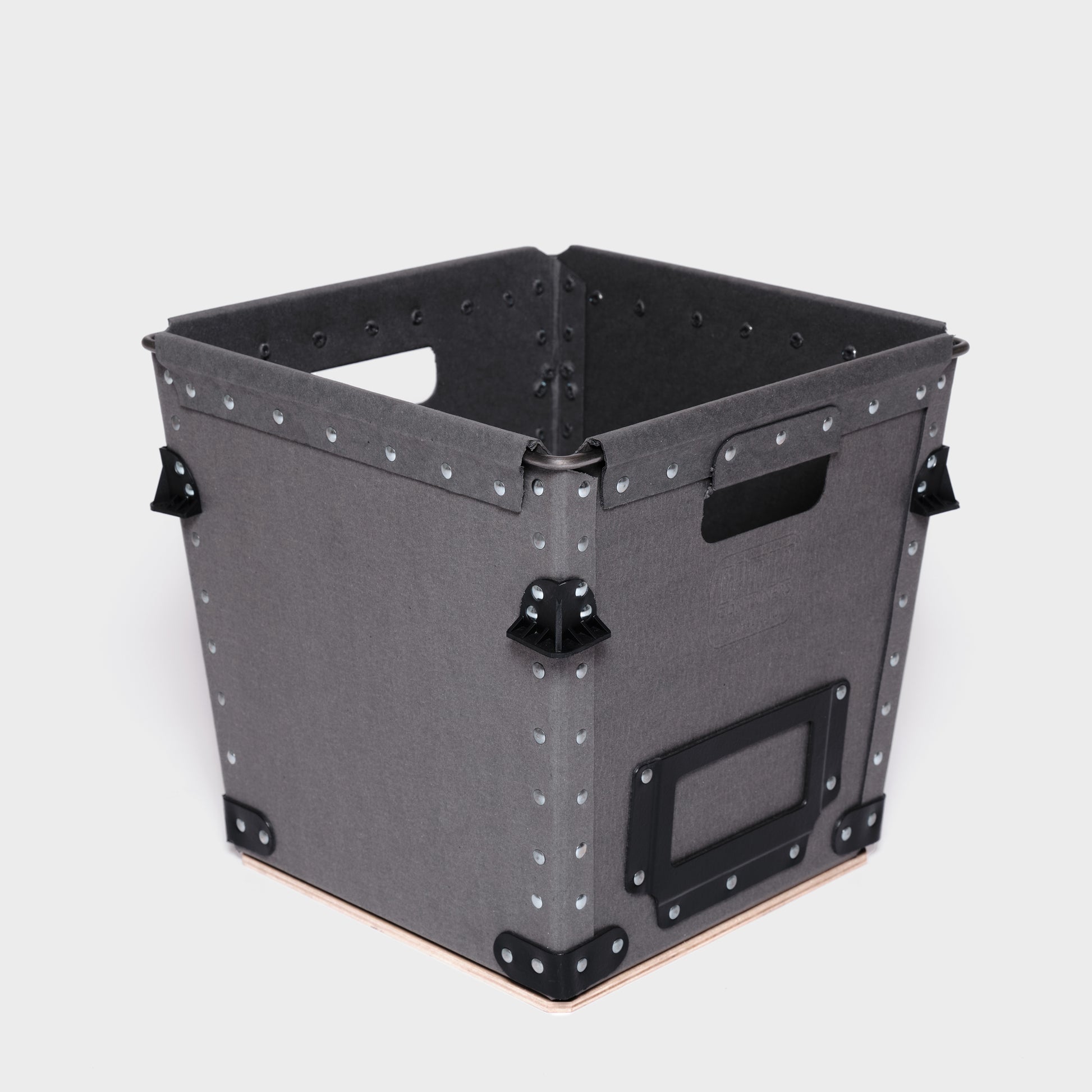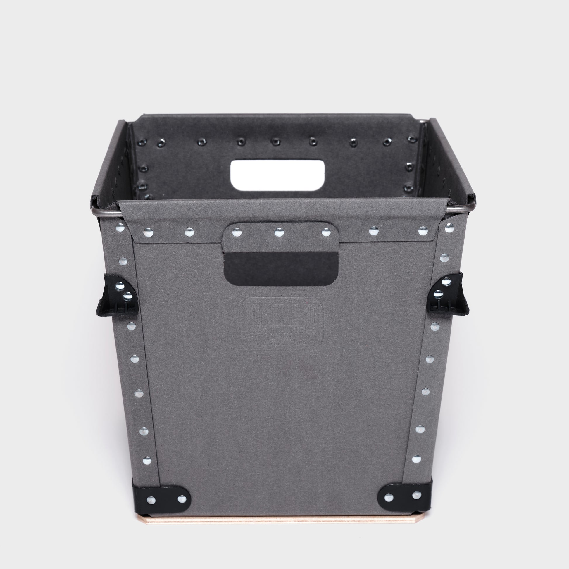 Every Damon Container is individually handmade to order. Cut fibreboard panels are bent and fixed around a rigid wire frame, with rivets applied using vintage machinery operated by humans and guided by eye. This process ensures each container has a unique, slightly irregular finish. Each container is completed with a sturdy plywood base for enhanced durability and features a tapered design for nested storage when not in use.