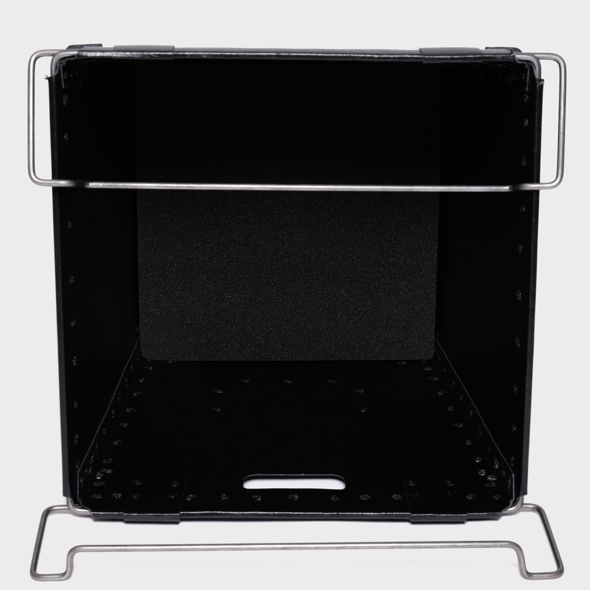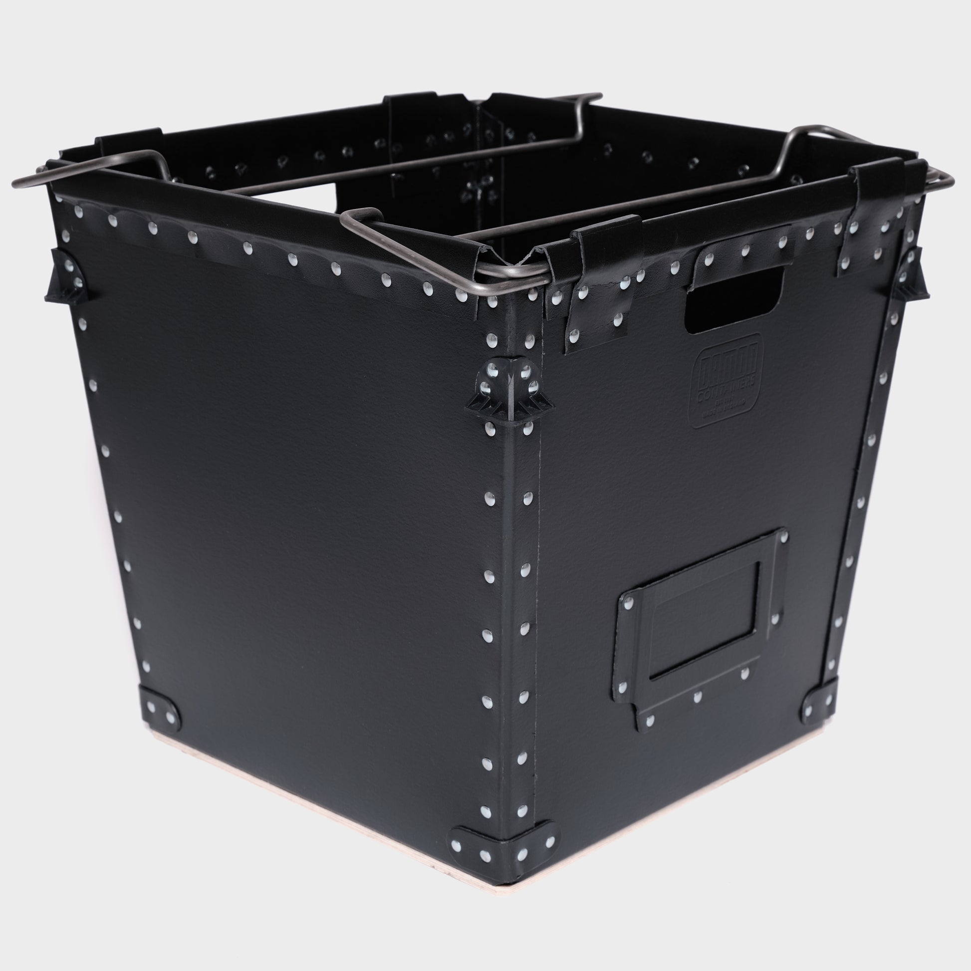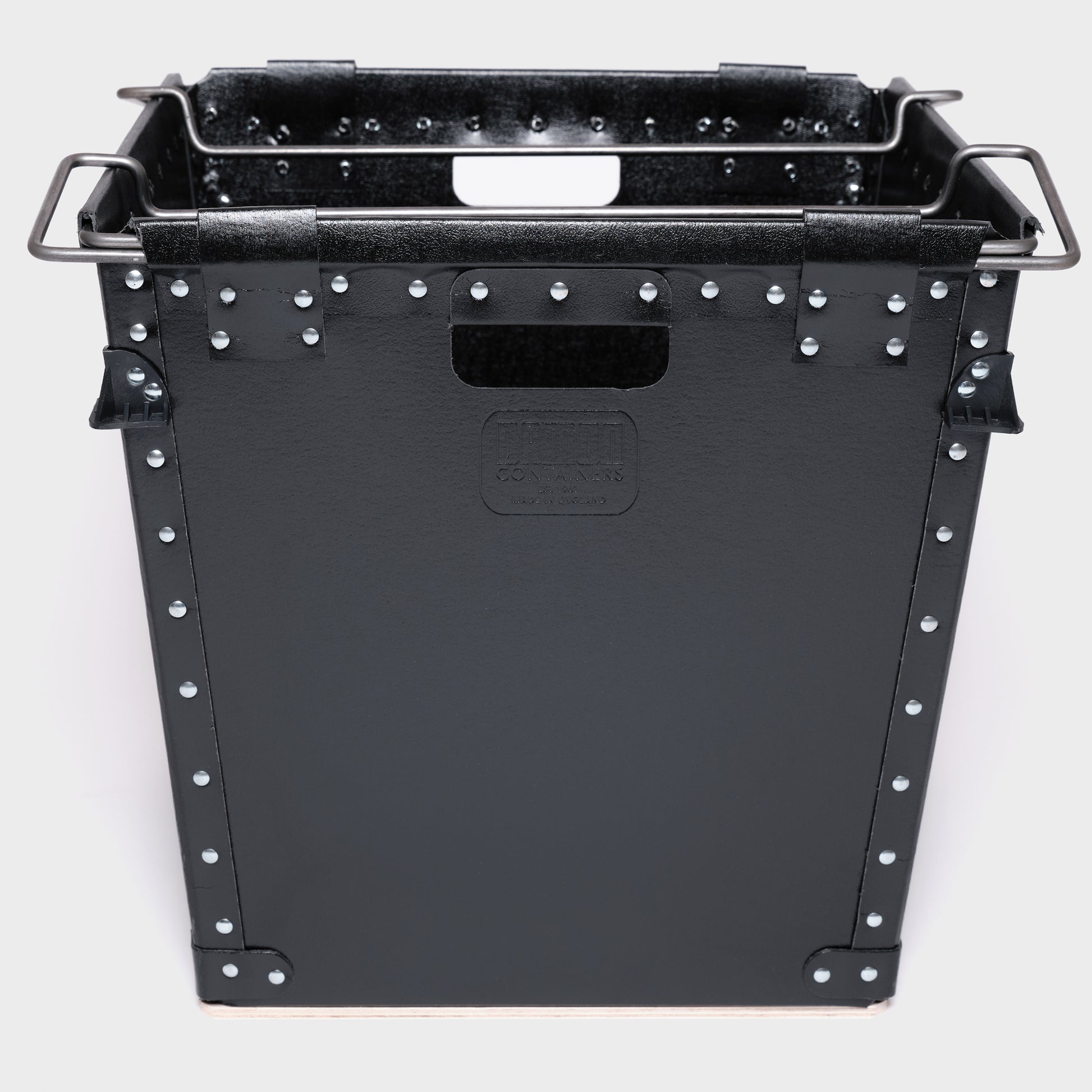 Every Damon Container is individually handmade to order. Cut fibreboard panels are bent and fixed around a rigid wire frame, with rivets applied using vintage machinery operated by humans and guided by eye. This process ensures each container has a unique, slightly irregular finish. Each container is completed with a sturdy plywood base for enhanced durability and features a tapered design for nested storage when not in use.
