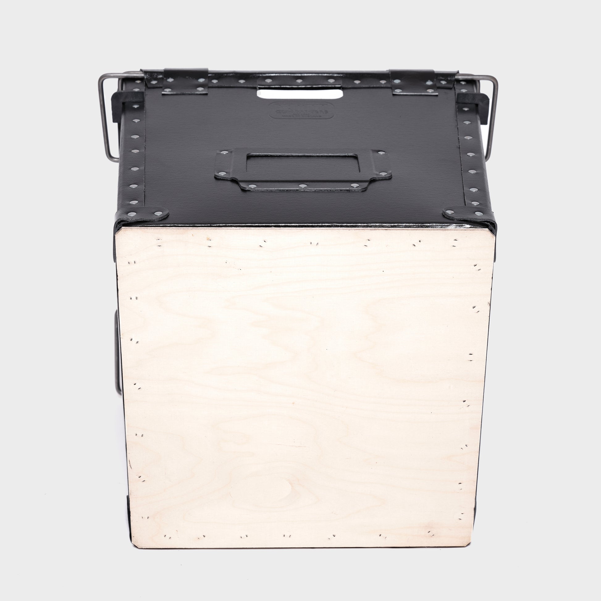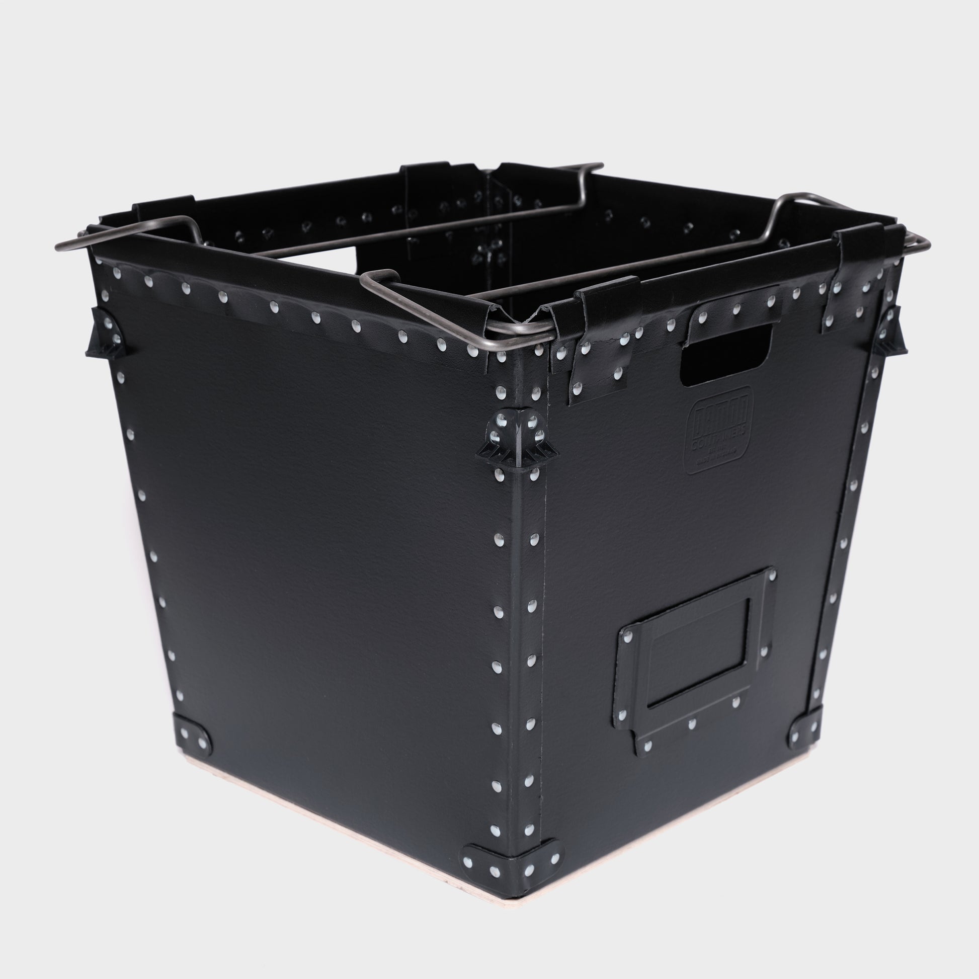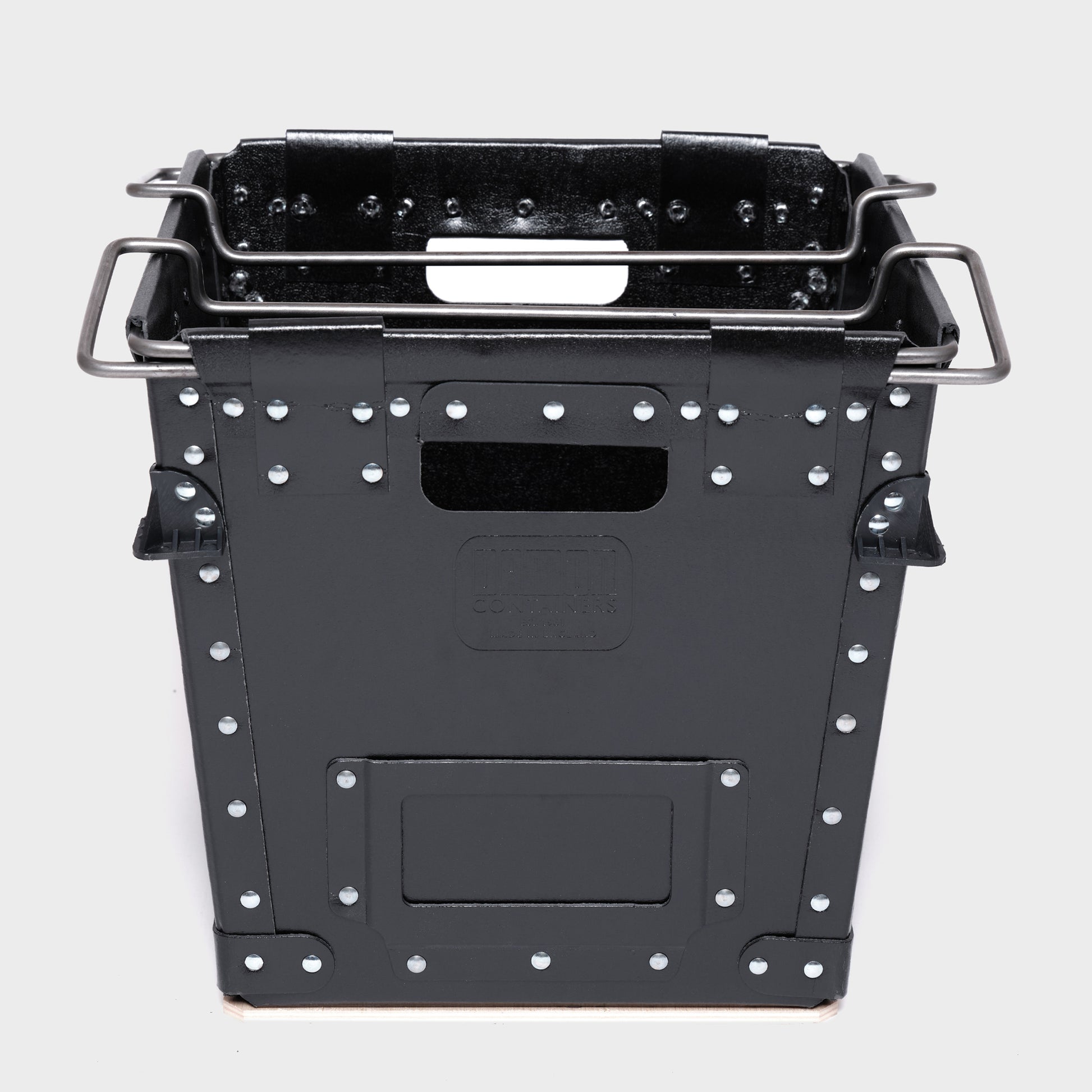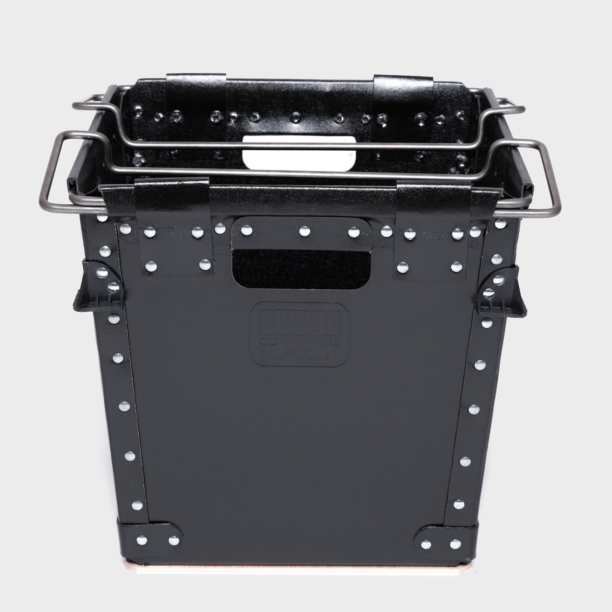 Every Damon Container is individually handmade to order. Cut fibreboard panels are bent and fixed around a rigid wire frame, with rivets applied using vintage machinery operated by humans and guided by eye. This process ensures each container has a unique, slightly irregular finish. Each container is completed with a sturdy plywood base for enhanced durability and features a tapered design for nested storage when not in use.