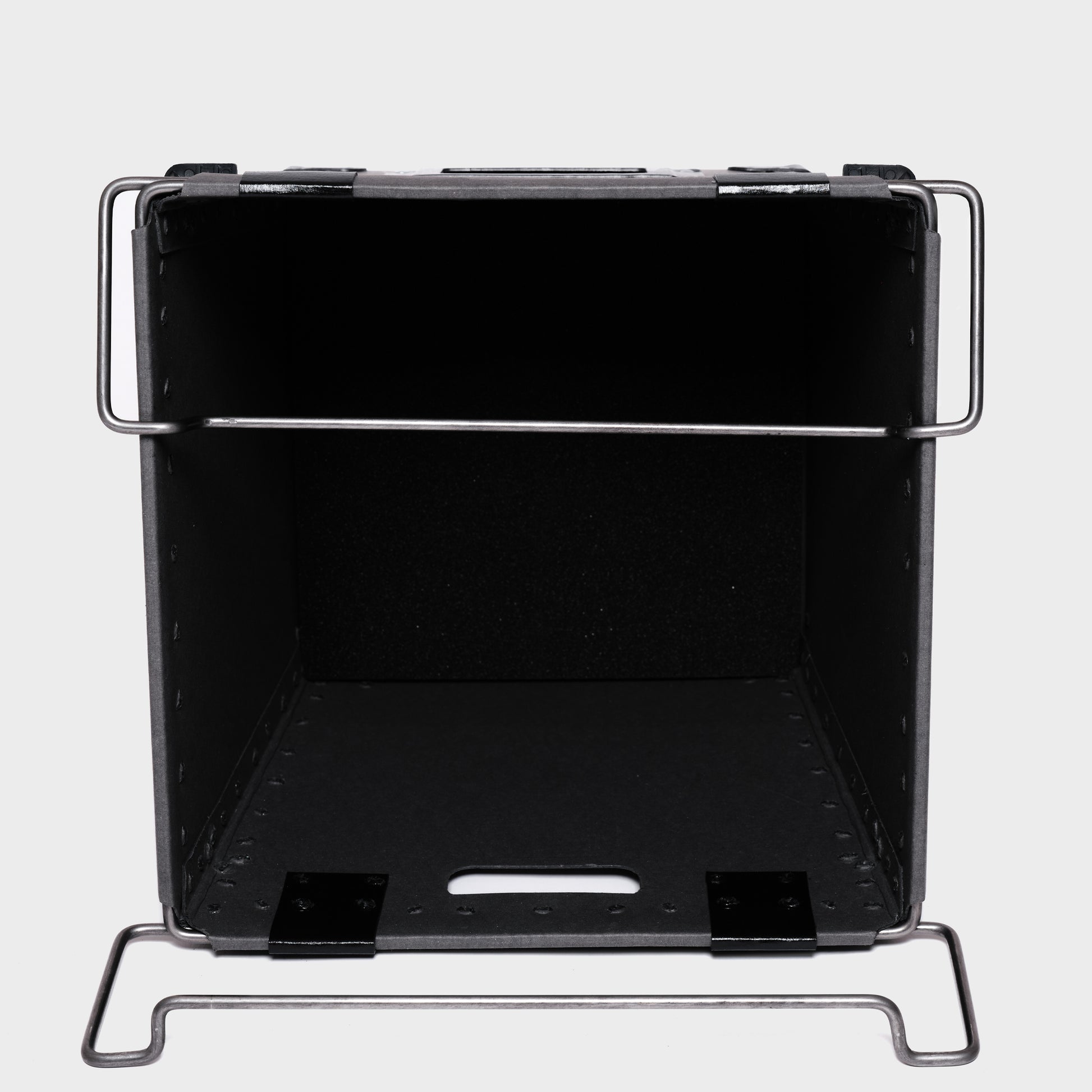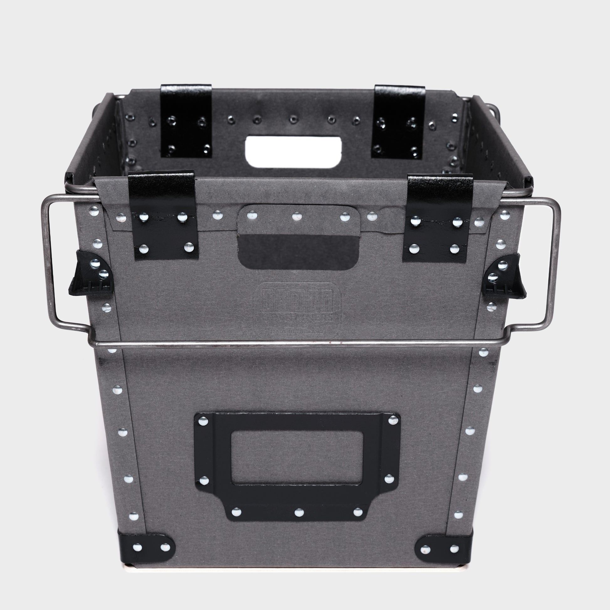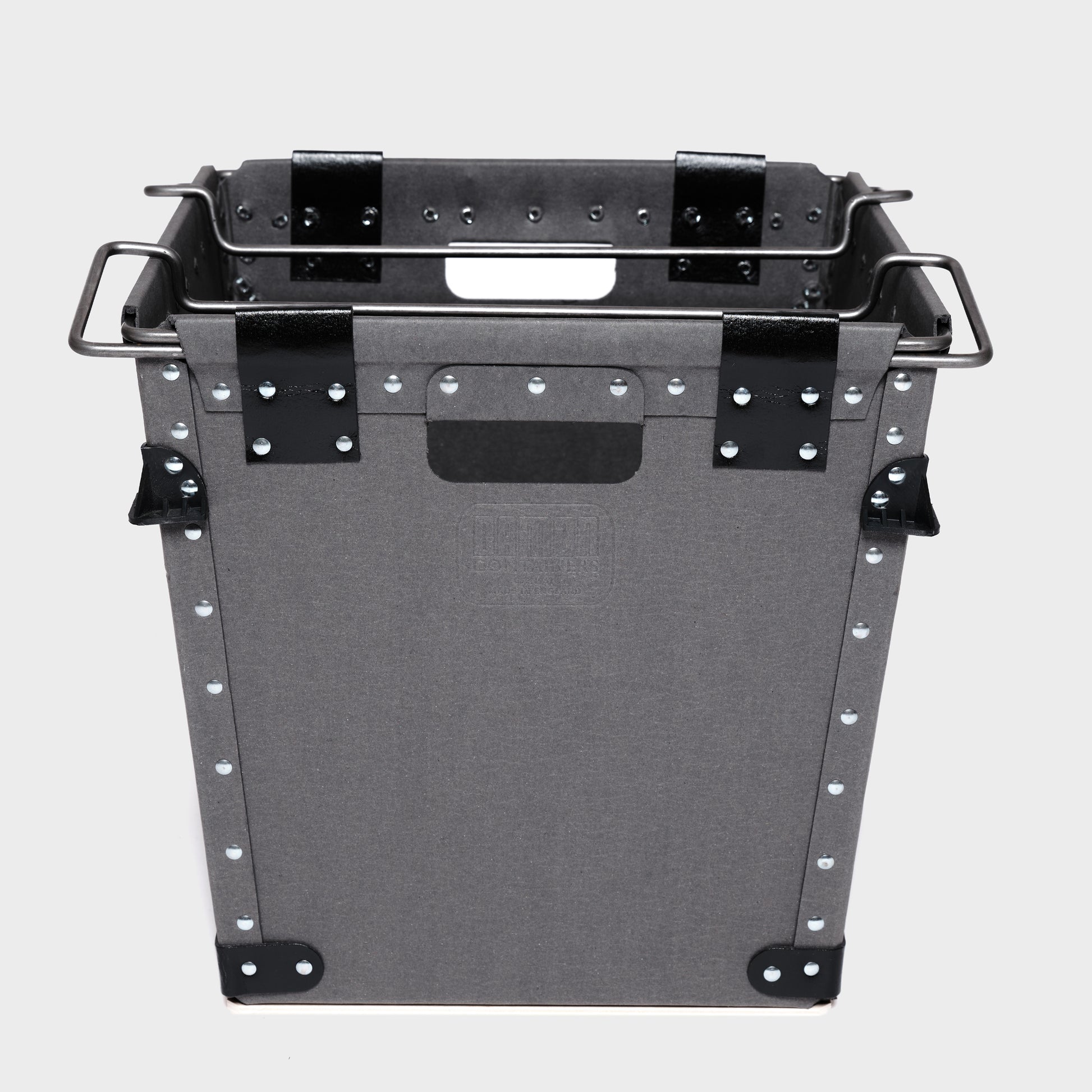 Every Damon Container is individually handmade to order. Cut fibreboard panels are bent and fixed around a rigid wire frame, with rivets applied using vintage machinery operated by humans and guided by eye. This process ensures each container has a unique, slightly irregular finish. Each container is completed with a sturdy plywood base for enhanced durability and features a tapered design for nested storage when not in use.