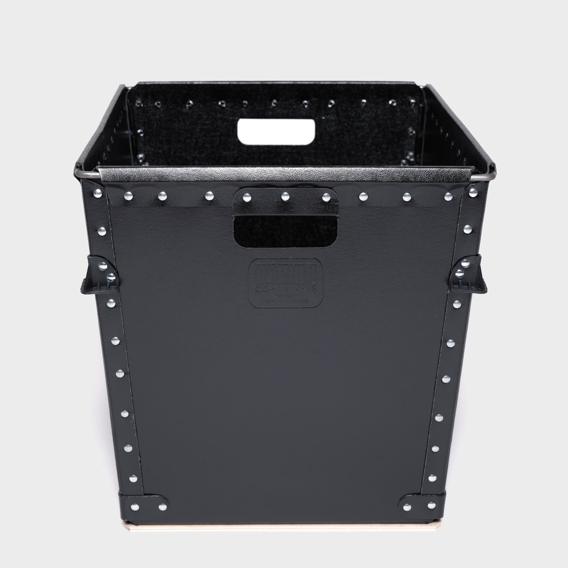 Every Damon Container is individually handmade to order. Cut fibreboard panels are bent and fixed around a rigid wire frame, with rivets applied using vintage machinery operated by humans and guided by eye. This process ensures each container has a unique, slightly irregular finish. Each container is completed with a sturdy plywood base for enhanced durability and features a tapered design for nested storage when not in use.