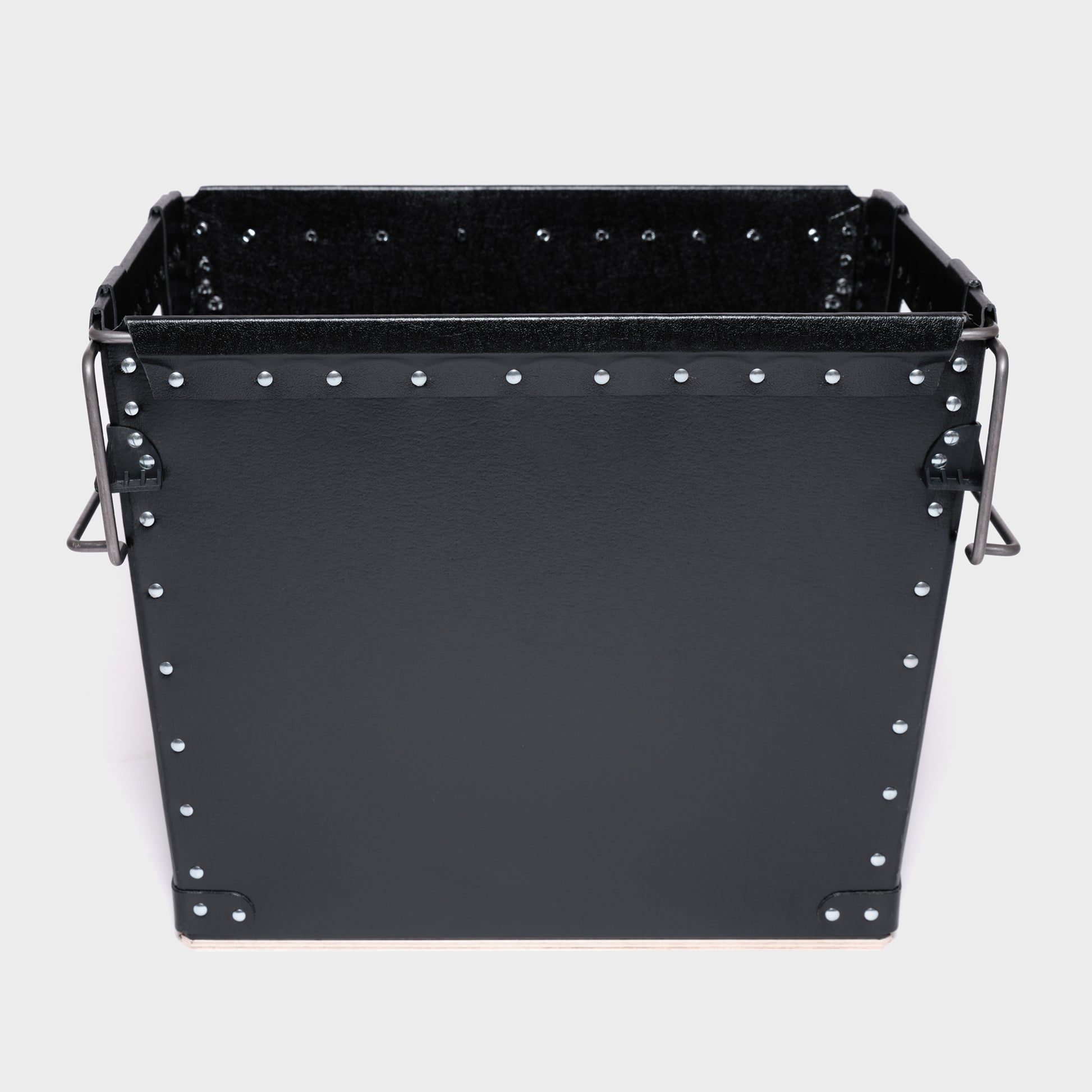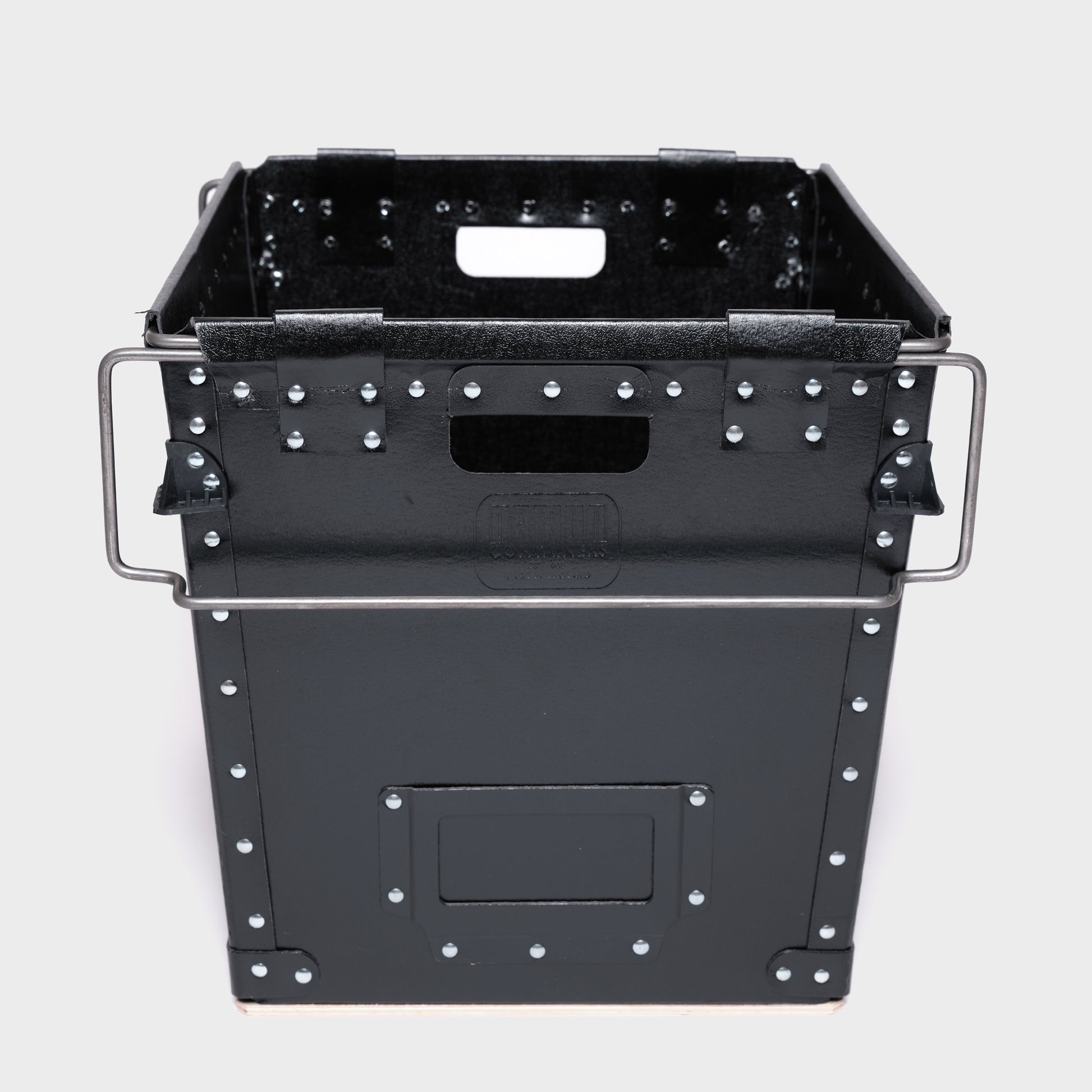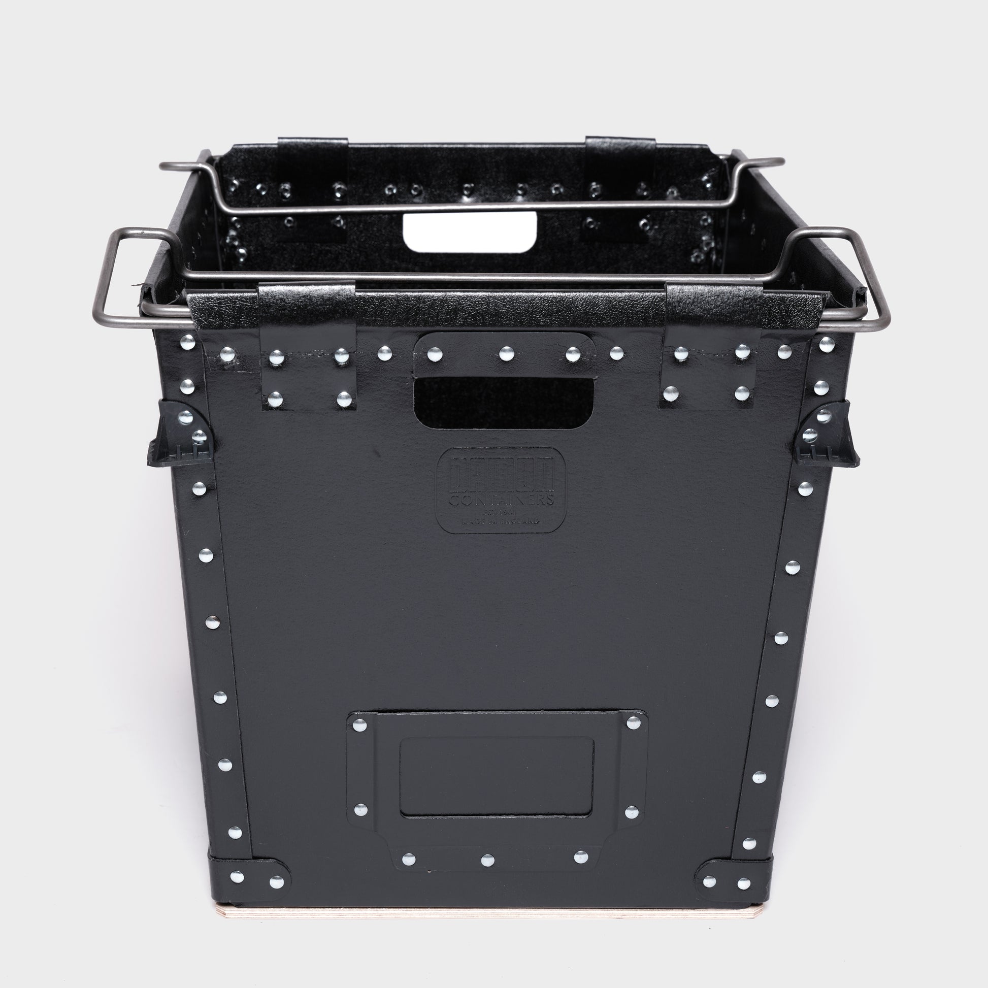 Every Damon Container is individually handmade to order. Cut fibreboard panels are bent and fixed around a rigid wire frame, with rivets applied using vintage machinery operated by humans and guided by eye. This process ensures each container has a unique, slightly irregular finish. Each container is completed with a sturdy plywood base for enhanced durability and features a tapered design for nested storage when not in use.